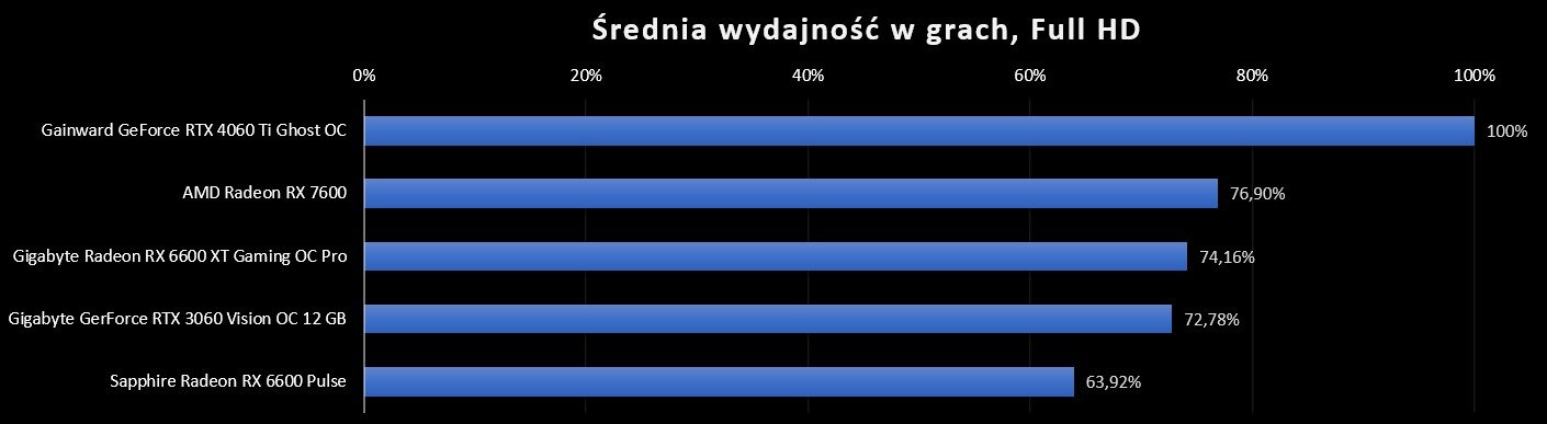 Jako że debiut RTX-a 4060 Ti w wydaniu partnerów Nvidii zbiegł się z premierą Radeona RX 7600, to rzecz jasna pojedynek ten staje się głównym punktem programu – i na tym też koncentruje się ten materiał. Okazało się jednak, że urządzenia sporo dzieli: GeForce jest od nowego dziecka AMD odczuwalnie lepszy. Po zestawieniu wyników obydwu kart widać jak na dłoni, że ta druga traci do lidera ok. 23% w Full HD i różnica ta zwiększa się wraz ze wzrostem rozdzielczości do 4K.