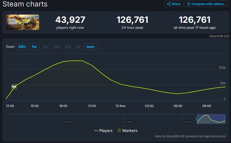 Można chyba śmiało powiedzieć, że wczorajsza premiera Farming Simulator 25 obudziła w wielu graczach wewnętrznego rolnika. Gra zaliczyła naprawdę udany debiut, przynajmniej biorąc pod uwagę liczbę osób, które zdecydowały się sięgnąć po produkcję studia Giants Software. W momencie pisania tego newsa tytuł zanotował na Steamie peak graczy na poziomie ponad 126 tys., zostawiając w tyle chociażby niedawno wydane Dragon Age: The Veilguard, w które w szczytowym momencie grało niecałe 90 tys. osób.