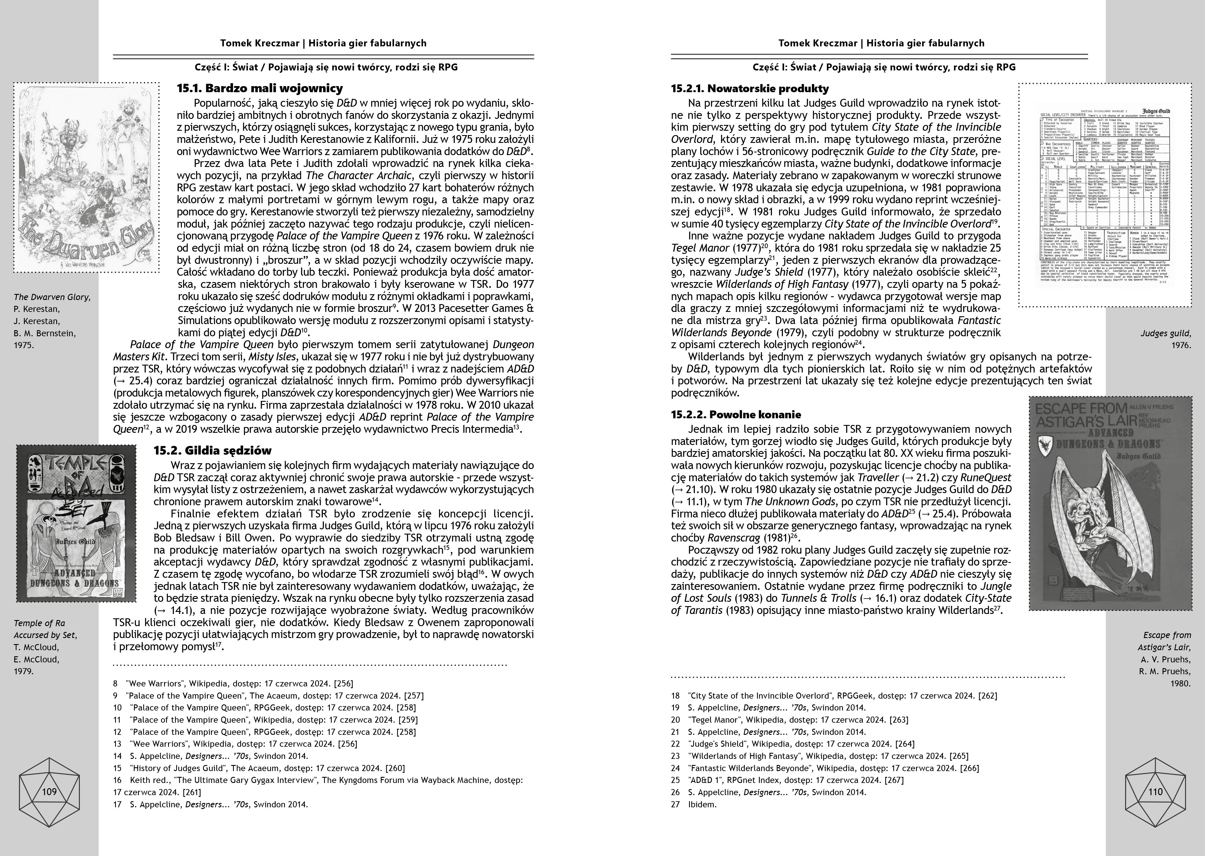 Mimo faktograficznego charakteru tej części książki, język i styl używany przez Kreczmara nie nudzi. Okazjonalne monotonne fragmenty przeplatane są ciekawostkami, a na co drugiej stronie widnieje okładka jakiegoś systemu gier fabularnych, co wizualnie przełamuje pełne cytatów ściany tekstu. Jedyny problem, jaki mam z tą częścią, to pewne zaburzenia w chronologii opowiadanej historii. Część bloków tematycznych rozrzucono tak, że czasem miałem wrażenie, jakbym między nimi czytał dygresję, która powinna wylądować zupełnie gdzie indziej. Trochę się jednak nie dziwię, bo złożoność tematu na pewno utrudniała zachowanie zarówno idealnej kolejności, jak i klarownej, ciekawej struktury. Mimo to, trochę przeszkadzało mi to w lekturze.