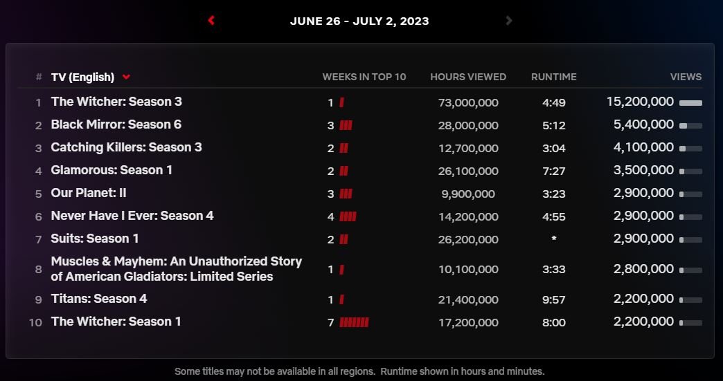 Na przykład w podobnym zestawieniu, jednak sięgającym przedziału 13-19 grudnia 2021, drugi sezon „Wiedźmina” osiągnął wynik równy 142,4 miliona godzin (niestety dokładniejsze dane nie są pokazywane, tak samo jak starsze, więc nie sięgniemy do sezonu pierwszego). Niemniej, trzeci sezon wciąż wypada o połowę gorzej, a pierwszy bił rekordy oglądalności całej platformy.