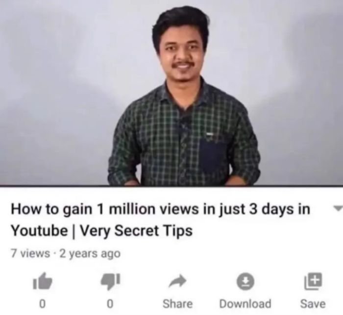 Ten gościu z How to gain 1 million views zrobił na prawdę sprytny trik. Nie zdobył ich w trzy dni, ale zdobył je. Tak na prawdę to ten mem jest sposobem na nabicie tych wyświetleń, sam go spreparował.