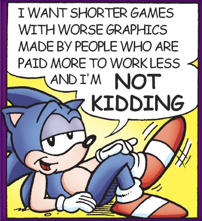 @Drozin Ten mem jest właśnie krytyką studiów AAA, dla których ostatnimi czasami liczy się jedynie jak najlepsza grafika i sztuczne przedłużanie długości ponad wszystko inne. Tutaj Sonic jest uosobieniem gracza, który chciałby, aby studia skupiły się bardziej na tym, co ważne.