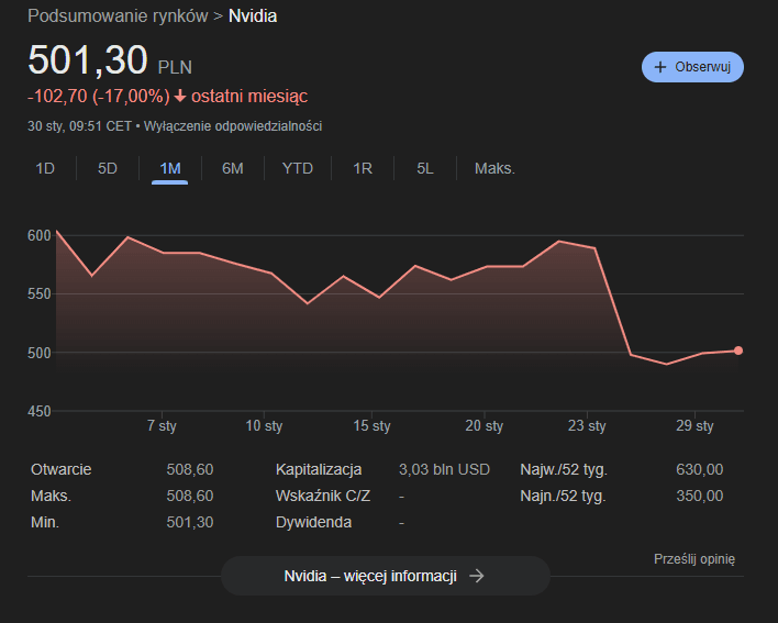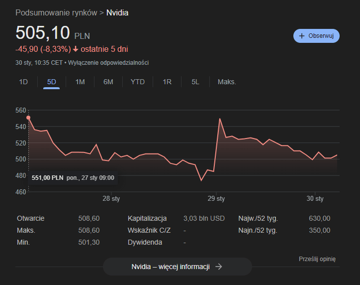 Jedna odpowiedź do “Akcje Nvidii zaliczają kolejny spadek. Tym razem winę ponosi plotka na temat pomysłu Trumpa”