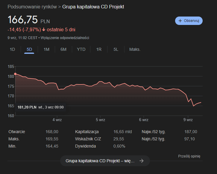 Oczywiście wieść o tym wydarzeniu nie przeszła bez echa wśród inwestorów, a akcje CD Projekt zaliczyły przez weekend spadek rzędu niespełna dziesięciu złotych, w najniższym momencie sięgając wartości 164,95 zł. Zdaje się jednak, że najgorsze już za spółką, a ceny akcji ponownie zaczynają stopniowo wzrastać.