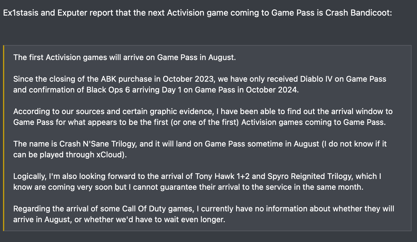 Na tym plotki się nie kończą, bo także inne gry Activision mogą wkrótce urozmaicić usługę Microsoftu – eXtas1s wspomina o Tony Hawk’s Pro Skater 1+2 i odświeżonej trylogii Spyro. Ponadto coraz więcej mówi się o tym, że po premierze Call of Duty: Black Ops 6 w Game Passie, do oferty Phila Spencera i spółki trafią również starsze odsłony shootera.