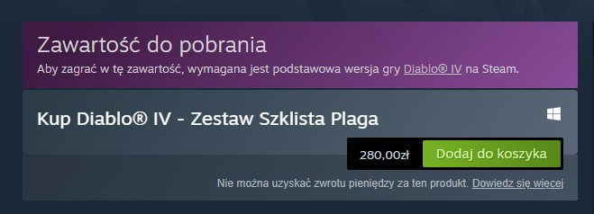 Jeśli taka cena za nowy kolorek brzmi jak przesada, to trzymajcie się mocno, bo Blizzard wpadł na lepszy pomysł: zestaw Szklista Plaga, w którym znajdziemy platynę, nowego wierzchowca i pancerz kosztuje w tym momencie więcej niż sama gra, bo trzeba wysupłać na niego aż 280 zł.
