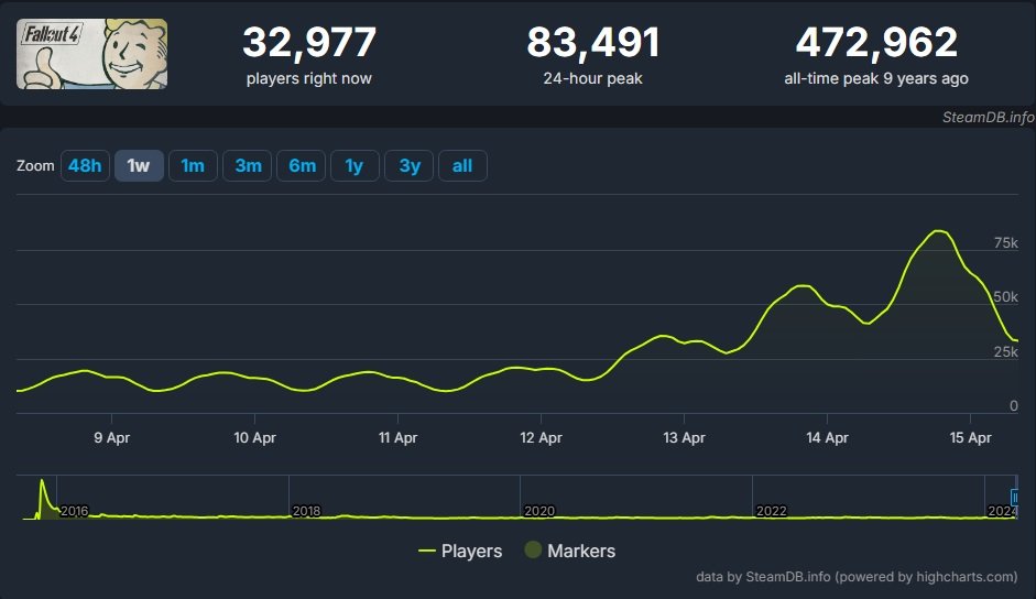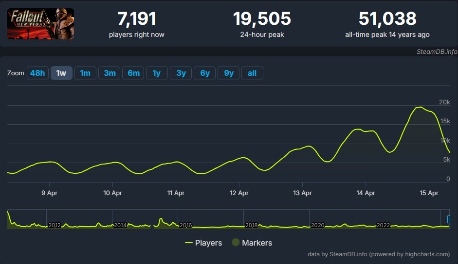 Spory wzrost graczy spotkał także starsze odsłony. W Fallouta: New Vegas na przykład w szczytowym momencie grało ponad 19 tys. osób, jeśli weźmiemy pod uwagę ostatnie 24 godziny. Z kolei Fallout 3 w wersji gry roku odnotował pod tym względem 6731 graczy. Co ciekawe, jest to wynik, któremu wcale nie tak wiele brakuje do rekordu grających jednocześnie osób w całej historii gry na Steamie, który wynosi 10401 graczy.
