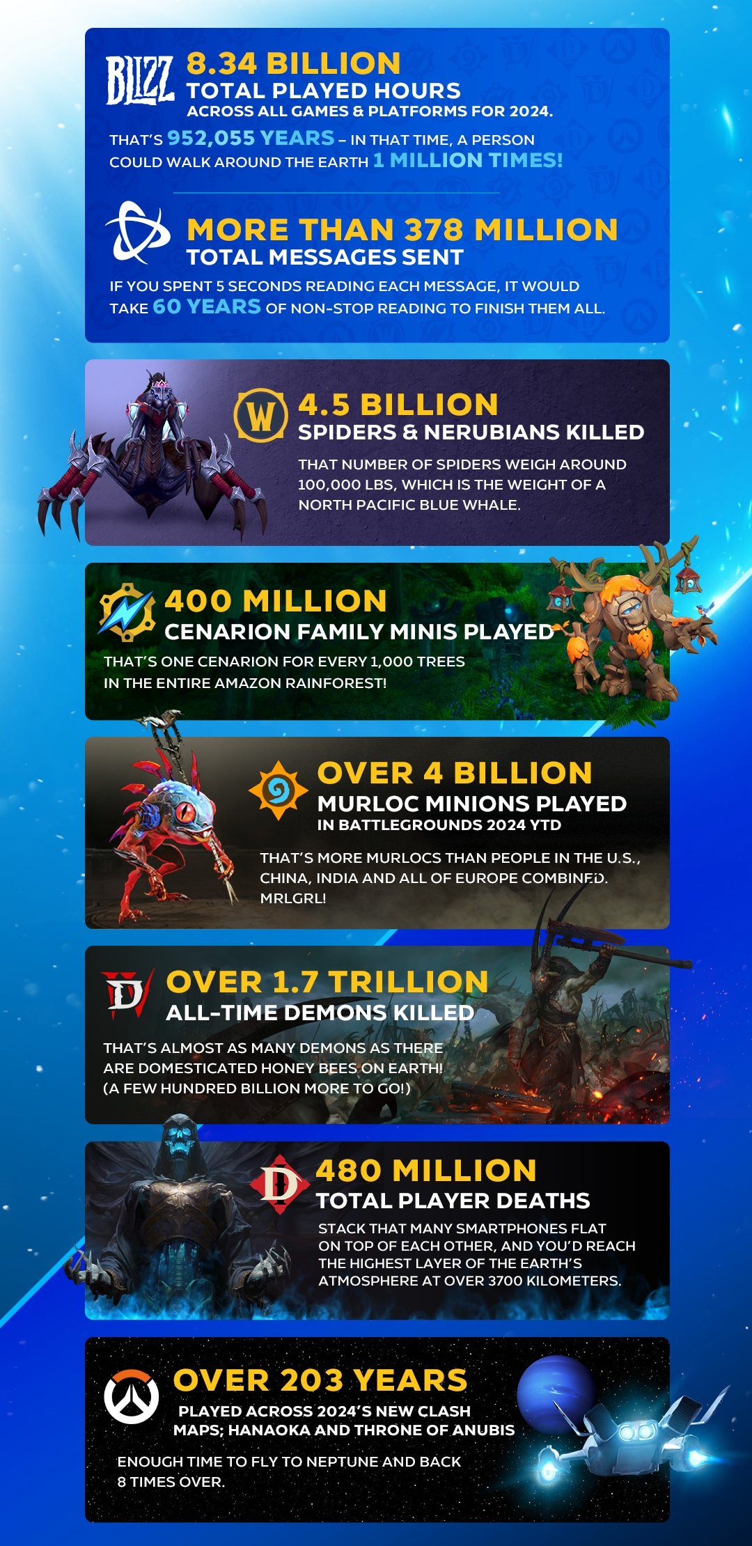 Może wyjdzie na to, że niepotrzebnie się czepiam, ale w moim mniemaniu podobnie jest ze wszystkimi udostępnionymi w tym roku statystykami Blizzarda: 4,5 miliarda zabitych pająków w WoW-ie, 480 milionów śmierci w Diablo Immortal, 203 lata „przegrane” w Overwatchu 2 itd. Wniosek? W 2024 roku bardzo dużo ludzi bardzo dużo grało w gry Blizzarda. Dziękuję za uwagę, a czytelników, których mimo wszystko nie zniechęciłem, zapraszam do rzucenia okiem na omawianą grafikę.