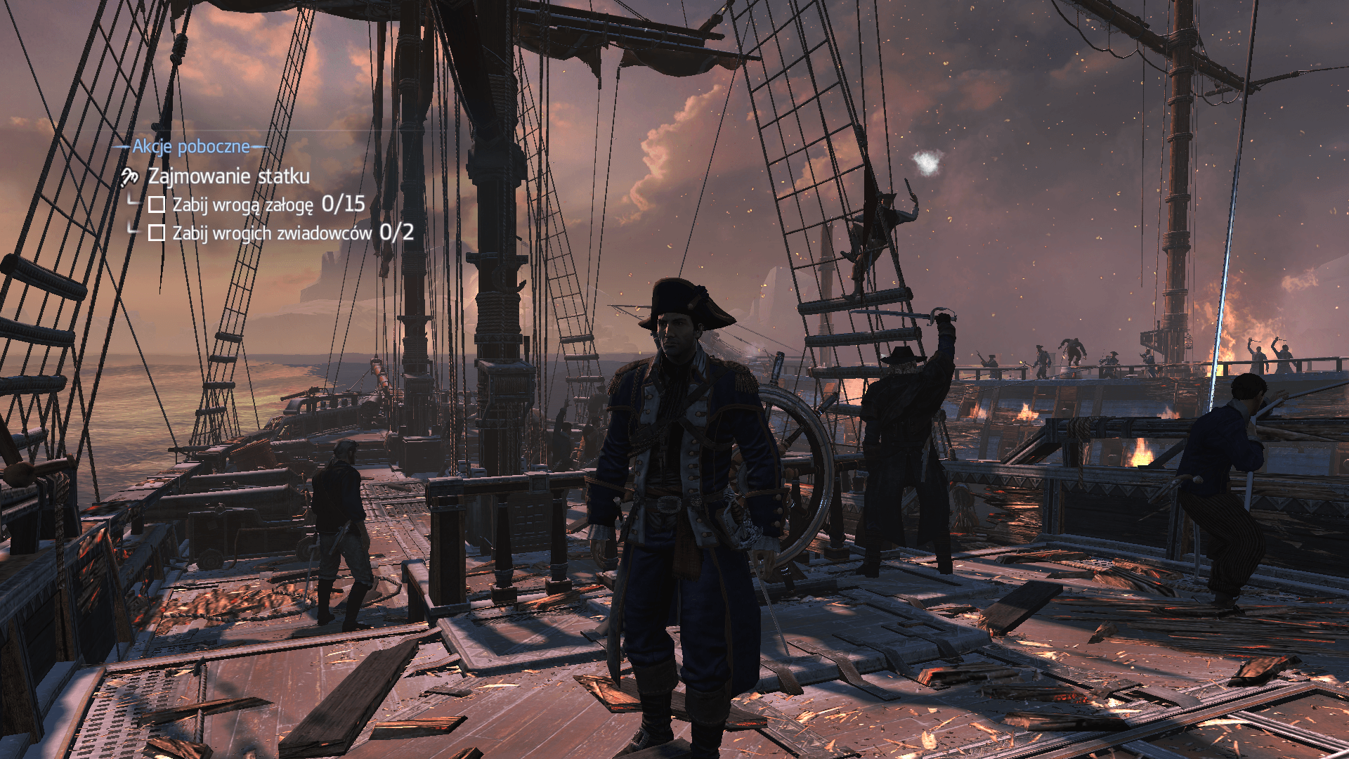 Załączony screenshot pochodzi z jednego z abordaży. Mamy tylko trochę roztrzaskane statki, bojowe pozy, pierwsze wystrzały, a załoganci szykują liny do zahaczenia wrogiego okrętu, słowem, preludium bitewnej pożogi. W tle lodowce, a wszystko to skąpane w różnorodnym oświetleniu. Moim zdaniem fotografia z jasną i ciemniejszą stroną doskonale oddaje ducha gry. Na środku stoi uwikłany w wydarzenia Shay, nieco sztywny, zmierzający do pokierowania swoim szczęściem i przy okazji losami wojny siedmioletniej oraz dwój antagonistycznych bractw…