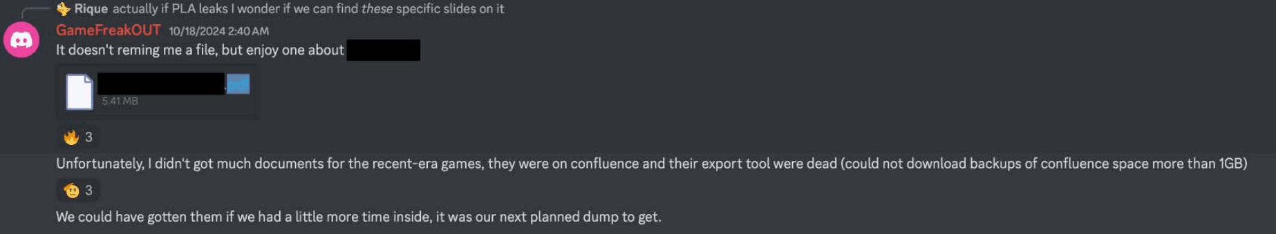 James D. Berkley, prawnik Nintendo, twierdzi, co dość oczywiste, że GameFreakOUT przekazywał dalej treści naruszające prawo. Do oświadczenia Nintendo dołączono zrzut ekranu z discordowego serwera, na którym wspomniany użytkownik zamieszcza plik, dodając przy tym „miłej zabawy”.