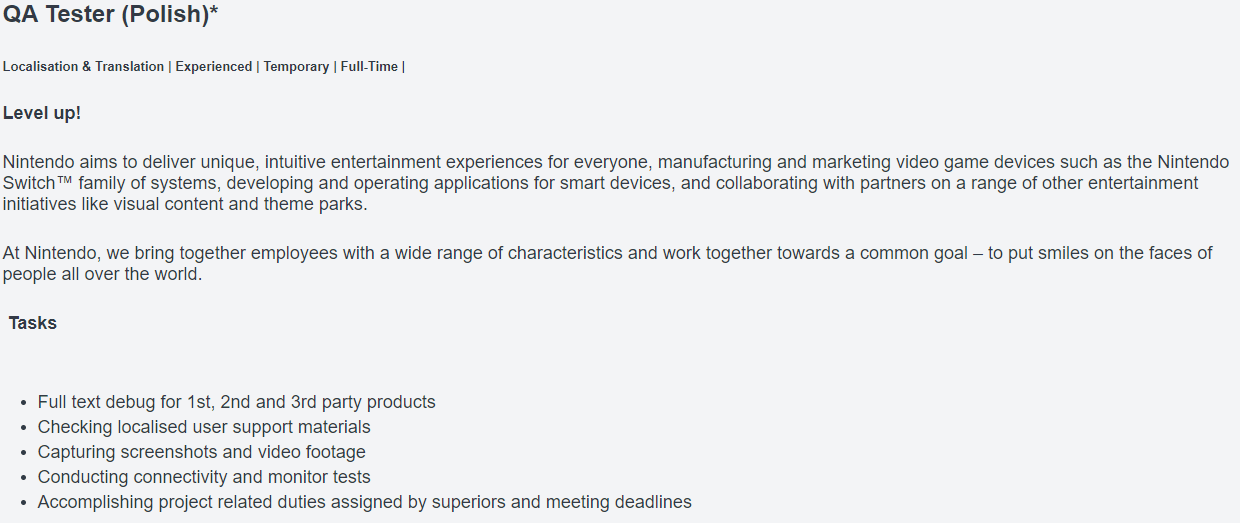 Wśród wymagań znajdziemy oczywiście znajomość języka na poziomie natywnym (ojczystym), wysokie umiejętności komunikacji w języku angielskim, doświadczenie w pracy tłumacza oraz standardowe pozycje, jak np. znajomość pakietu MS Office. Wedle opisu w obowiązkach znaleźć możemy między innymi opracowywanie oprogramowania dla produktów zarówno należących bezpośrednio do Nintendo, jak i tworzonych na zlecenie firmy.