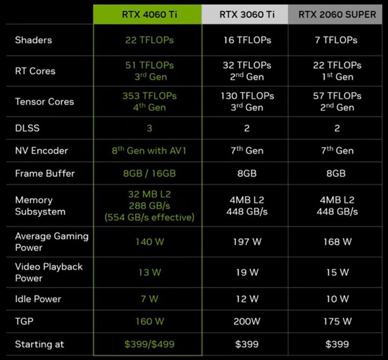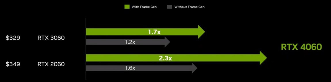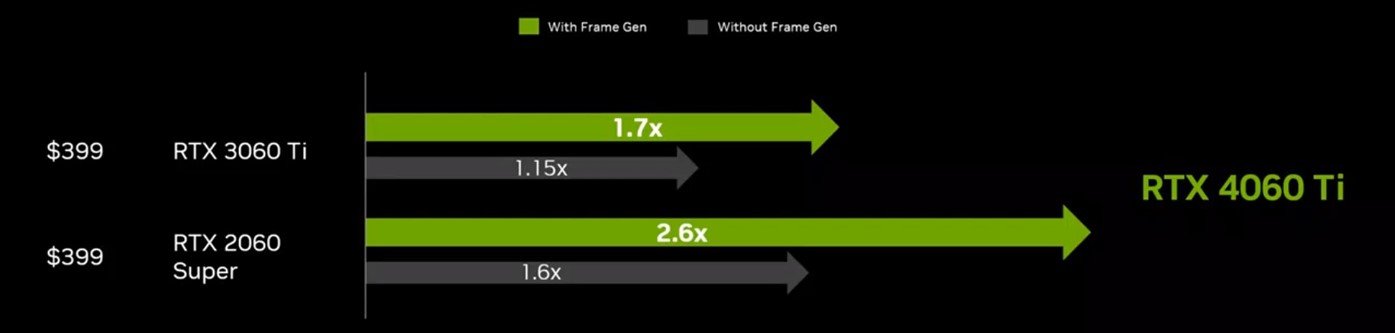 Dobrą wiadomością jest to, że Nvidia nie podniosła ceny – karta będzie kosztować wyjściowo tyle, ile RTX 3060 Ti oraz RTX 3060 Super, czyli 399 dolarów. Jeśli chodzi o wydajność, to jej skok – przynajmniej w ujęciu surowych możliwości karty – zaskakująco duży jednak nie będzie. Nvidia w przypadku RTX-a 4060 Ti deklaruje 115% wydajności poprzednika oraz 160% wydajności RTX-a 2060 Super. Równocześnie jednak producent podkreśla, że nowe karty zostały wyposażone m.in. w DLSS 3 z technologią Frame Generator – tutaj zaś przyrost liczby klatek ma być bardziej okazały. Patrząc na nową konstrukcję w ten sposób, możemy liczyć na 170% wydajności RTX-a 3060 Ti oraz aż 260% wydajności RTX-a 2060 Super.