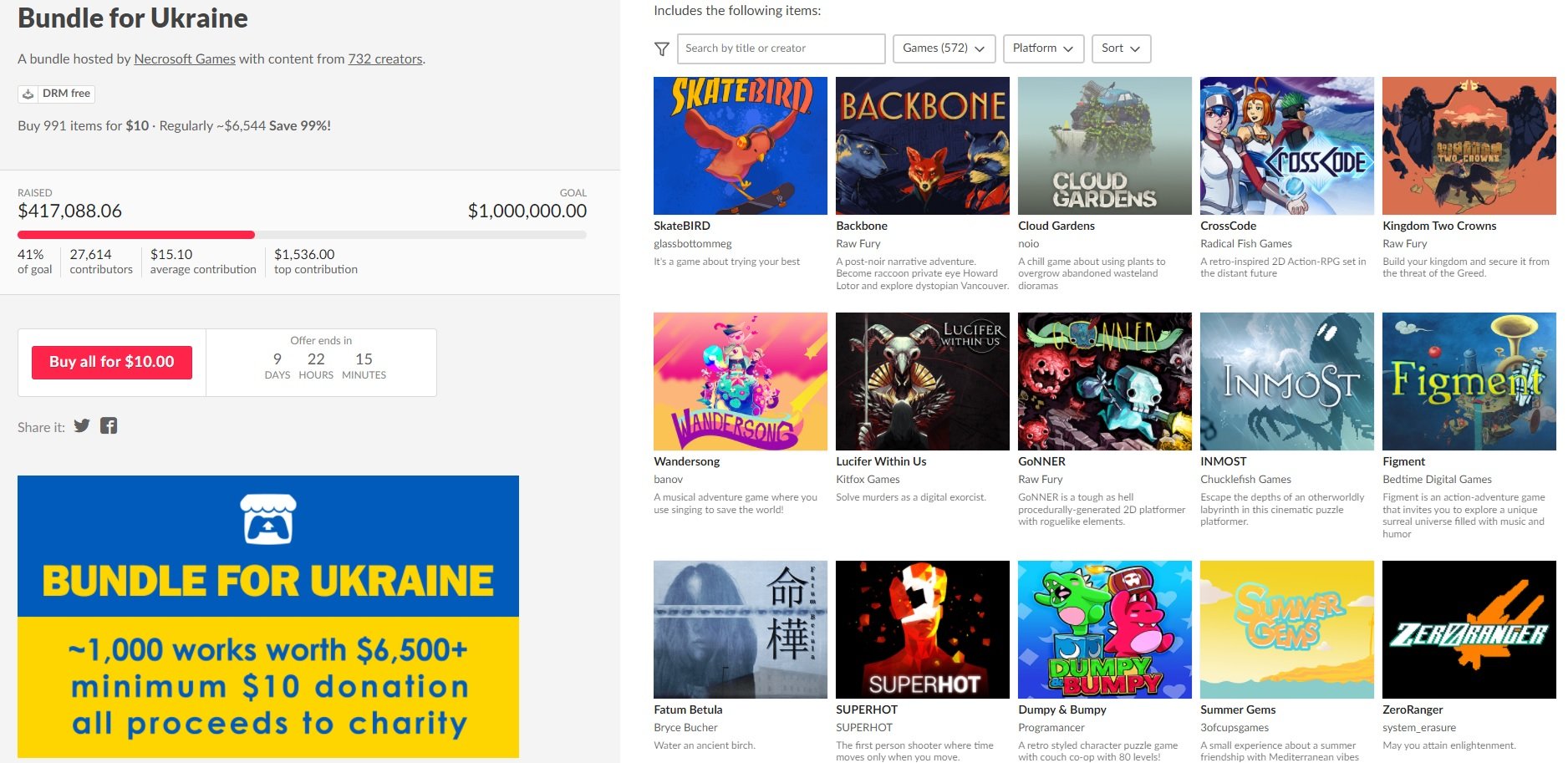 Równolegle gracze i developerzy stale zbierają pieniądze na pomoc Ukraińcom. Wielkim sukcesem zakończyła się akcja 11 bit studios, a w ślad za firmą szybko poszli inni twórcy. Na itch.io ruszyła teraz z kolei inna inicjatywa: w ramach Bundle for Ukraine za co najmniej 10 dolarów możemy zdobyć 991 przedmiotów. Przede wszystkim gier – jest ich tu 572 – ale znajdziemy tu także książki, komiksy czy soundtracki. Oczywiście mile widziane są wyższe wpłaty: najwyższa wyniosła w tym momencie ponad 1500 dolarów.
