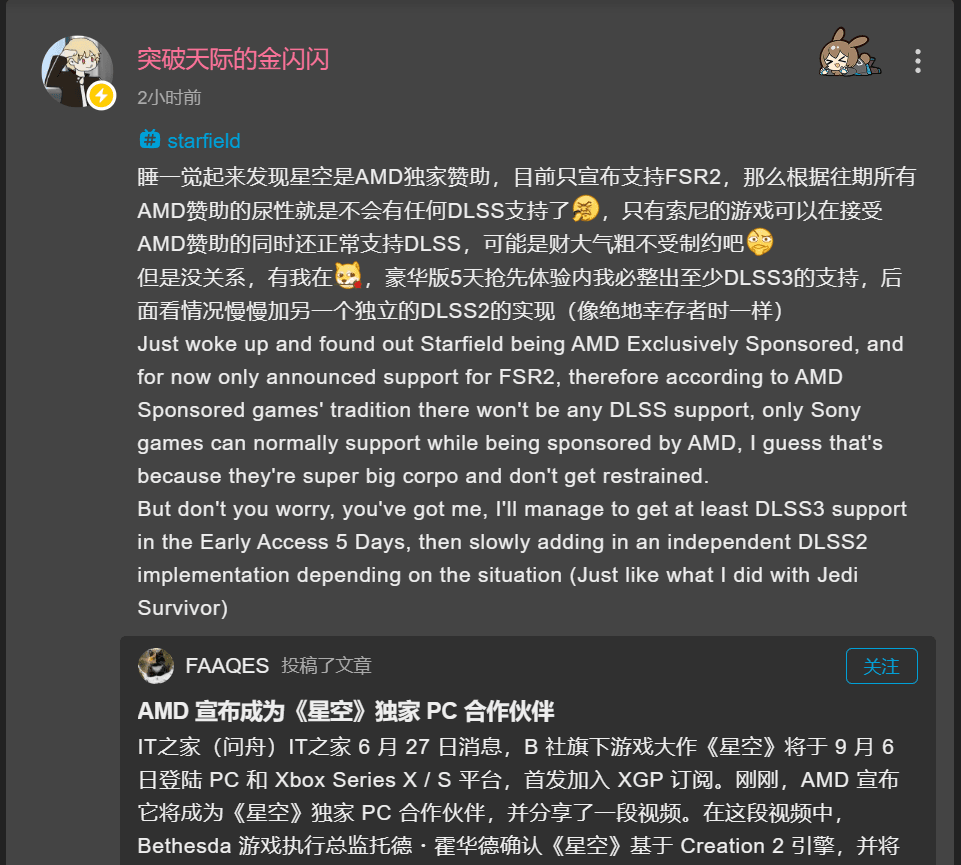 Niejako w odpowiedzi na apel Todda Howarda, a trochę w ramach reakcji na współpracę developerów z AMD i hipotetyczny brak obsługi DLSS w Starfieldzie, jeden ze znanych modderów zapowiedział że planuje dodać do gry obsługę technologii Nvidii już w pierwszych dniach po premierze. To ten sam gość, którego kojarzymy z implementacji DLSS w Star Wars Jedi: Survivor, Skyrimie, a także Elden Ringu. Co więcej, PureDark zapowiada, że zrobi to w ramach wczesnego dostępu (zagramy do 5 dni wcześniej w zależności od kupionej edycji).