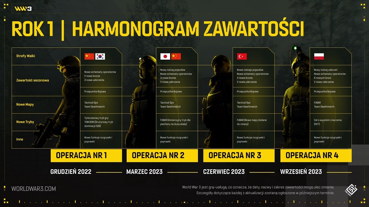 Pierwsze wydarzenie rozpocznie się w grudniu 2022 roku, a kolejne trzy już w przyszłym roku. Należy w tym miejscu zaznaczyć, że są to tylko przybliżone terminy poszczególnych trybów i mogą one ulec zmianie, jeśli twórcy będą zmagać się z innymi problemami. World War 3 powstaje bowiem w ogromnych bólach.