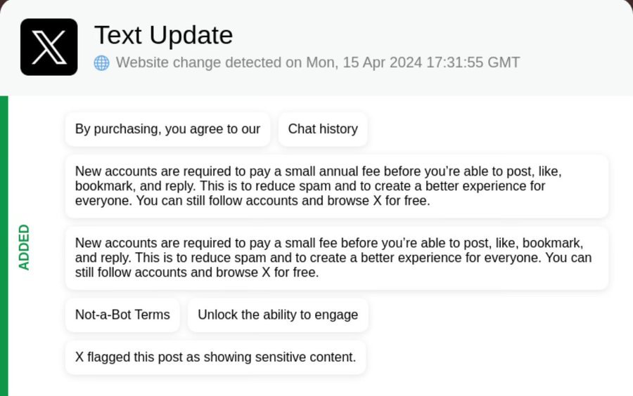 Dwa konta w serwisie X, X Updates Radar i X Daily News, dokopały się do informacji, jakoby portal pod wodzą Elona Muska planował wprowadzenie wymogu uiszczenia drobnej opłaty przez nowych użytkowników, nim ci otrzymają możliwość publikowania postów, rozdawania polubień, zapisywania wpisów i odpowiadania na nie.