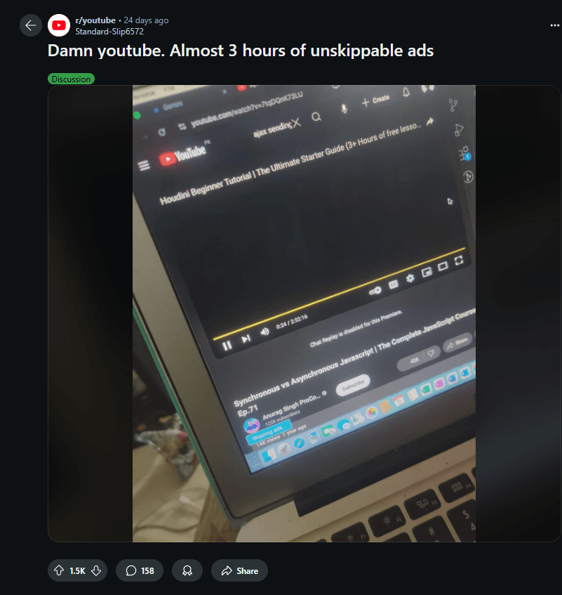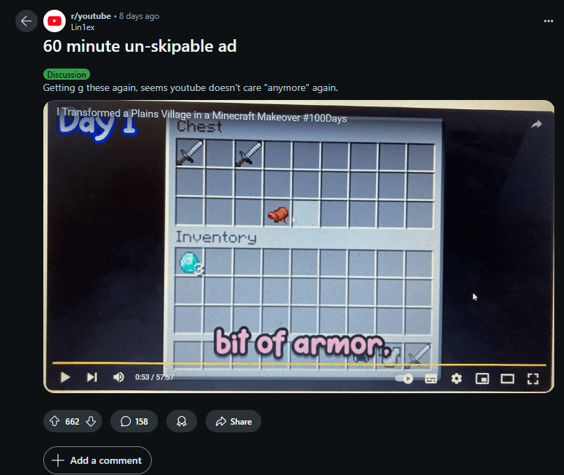 Dla przykładu, jeden z użytkowników Reddita, znany na platformie jako Lin1ex, wstawił zdjęcie ekranu, na którym widać trwającą 57 minut i 57 sekund reklamę (w zasadzie będącą całym filmem przedstawiającym rozgrywkę w Minecrafta). Problem w tym, że nigdzie nie widać przycisku „pomiń reklamę”, a więc, aby powrócić do oglądanego aktualnie materiału, teoretycznie należy obejrzeć godzinny materiał z machania kilofem i poszukiwania diamentów.