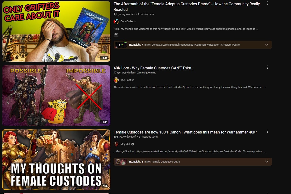 Konflikt o Custodian stał się bowiem pożywką dla wszelkiej maści youtuberów żyjących z podsycania wojen kulturowych. Ludzie, którzy w wielu przypadkach nie odróżniliby Kosmicznego Marine od Prymarchy, zajęli się nie tylko recenzowaniem poczynań Games Workshop (rzekomo obrało ono disneyowski kurs na wokeizm), lecz także propagowaniem informacji o wątpliwej autentyczności oraz tworzeniem zwykłych fejków.