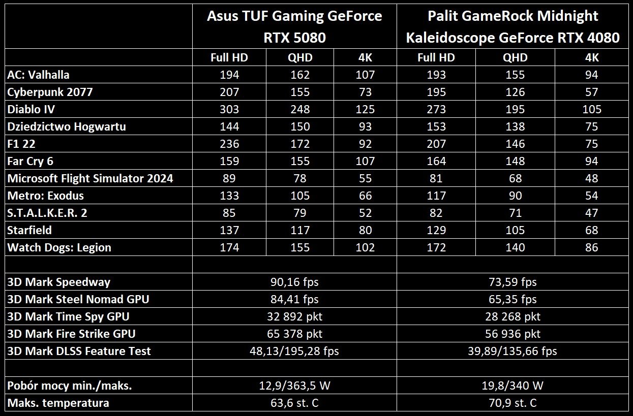 Rzecz jasna to wyniki uśrednione. W zależności od produkcji jest zaś raz lepiej, raz gorzej. Podczas testów miałem dość spore problemy ze stabilnością Diablo IV i Dziedzictwa Hogwartu – gry te często się nie uruchamiały, a druga z nich zwracała rezultaty o dużym „rozrzucie”. Niestabilny był również 3D Mark – i to niezależnie, czy mówimy o wersji powszechnie dostępnej, czy przedpremierowej. Oczywiście zakładam, że to choroby wieku dziecięcego driverów – jak Nvidia je dopracuje, to kłopoty znikną. Rozczarowujące wyniki, choć już bez problemów technicznych, osiągnął z kolei Stalker 2, który na nowej karcie działa o ok. 10% lepiej w 4K, niewiele większy przyrost wydajności zanotował też Microsoft Flight Simulator 2024 – tutaj można liczyć na mniej niż 15% zysku względem RTX-a 4080.