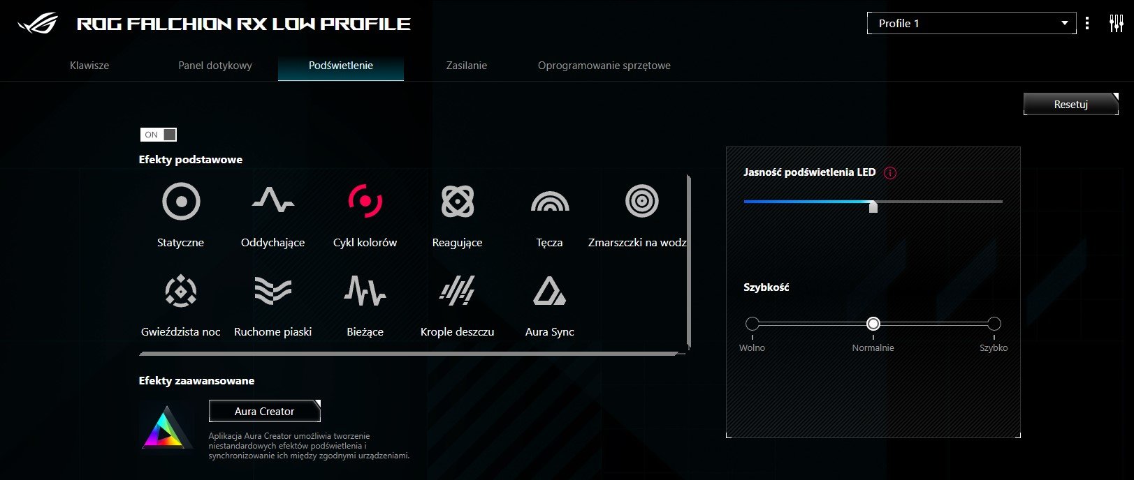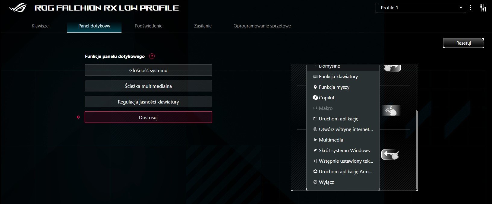 Trochę trudno w to uwierzyć, ale producent upchnął w Falchionie dotykowy panel. Znajduje się on po lewej stronie, na niewidocznej dla użytkownika krawędzi – łatwo go jednak wymacać dzięki wgłębieniu i kropkom na całej długości. Możemy dzięki niemu m.in. sterować głośnością czy jasnością urządzenia, a nawet przypisać tam szereg innych funkcji. Z kolei wspomniany podświetlany pasek z napisem „Republic of Gamers” nad klawiszami jest niejako powiązanym z nim „ekranem”, służąc nam chociażby jako skala głośności. Do softu nie mam większych zarzutów: ot, czasem tylko nie wiedzieć czemu odświeża widok klawiatury, lekko się przywieszając. Więcej jego grzechów nie pamiętam.