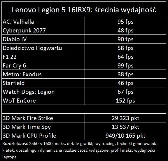 Lenovo Legion 5 16IRX9 tak czy inaczej jest urządzeniem wydajnym i pozwalającym bez większych przeszkód pograć w natywnej rozdzielczości nawet w bardziej wymagające tytuły, no, może nie licząc tradycyjnie na profilu Extreme przegiętego Metro Exodus. Warto przy tym pamiętać, że wyniki, które widzicie w tabelce, przedstawiają opcję maksimum, czyli każdorazowo najwyższe dostępne detale wyświetlanej grafiki, jednakże bez ray tracingu. Pola do manewru z ustawieniami jest więc aż nadto, jeśli zechcemy zwiększyć płynność.
