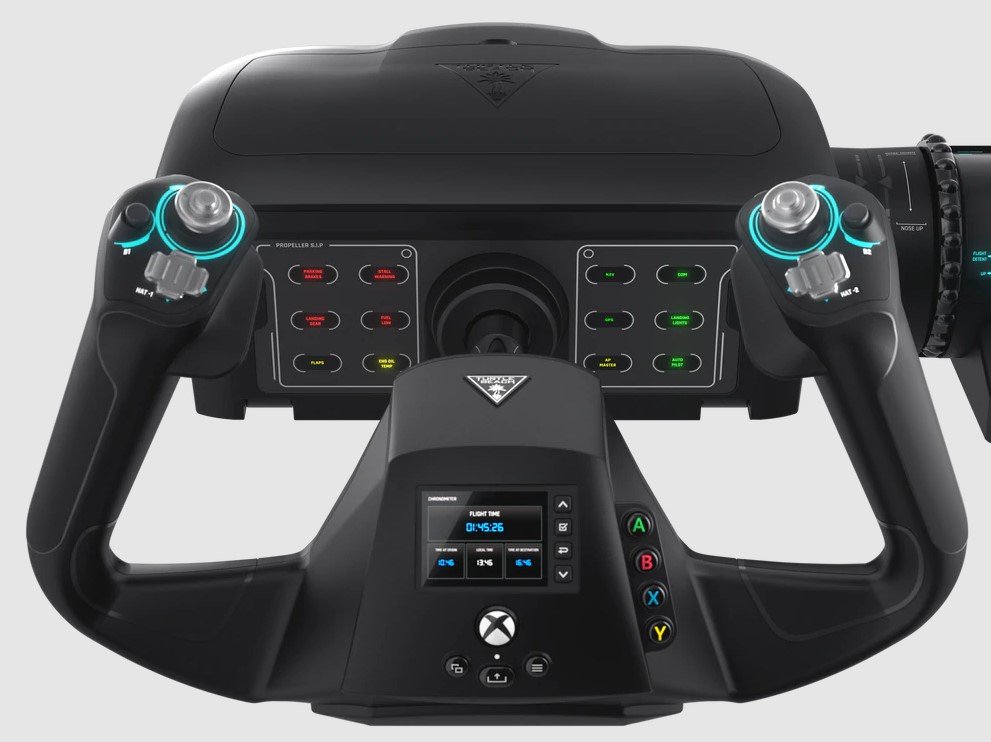 Nowe urządzenie Turtle Beach zostało stworzone głównie z myślą o Flight Simulatorze, do tego współpracuje z różnymi platformami – pecetami i konsolami Xbox (zarówno One, jak i Series X|S). Pierwsze skrzypce gra tu oczywiście wolant, zastępujący typowy w zestawach ze średniej i niższej półki dżojstik. Kontroler ten wyposażono w przyciski, które nie dość, że są liczne, to jeszcze zostały bardzo dobrze rozplanowane. Na obu jego ramionach znajdziemy po bumperze, analogowym spuście i dodatkowym guziku, trafiły tam również grzybki POV i HAT – po jednym z każdej strony. W centralnej części wolanta umieszczono cztery przyciski kontrolera Xbox, dodatkowe cztery guziki funkcyjne, a także kolorowy ekran LCD wraz ze sterowaniem. Dzięki temu ostatniemu możemy przerzucać się pomiędzy platformami (tryby PC i Xbox – zależnie od tego, do czego podłączymy VelocityOne), a także zmieniać ustawienia sprzętu, konfigurować podświetlenie, zapisywać profile czy przeprowadzać aktualizacje oprogramowania.